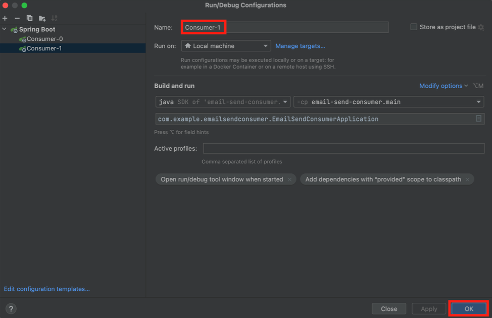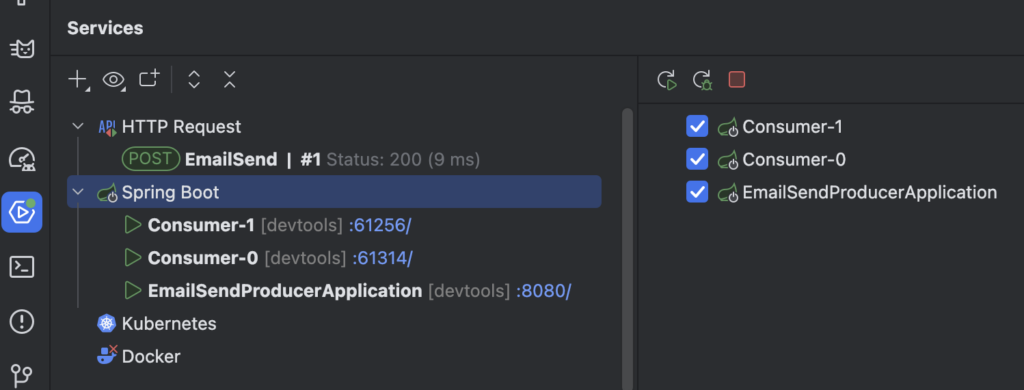 우리는 email.send 토픽이 기본값이 1개의 파티션(email.send-0)을 가지고 있다고 가정하고, Spring Boot 컨슈머 서버를 두 대 (consumer-0, consumer-1) 실행하여 테스트를 해본다